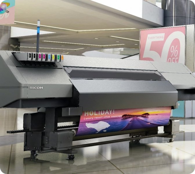 Сушка латексных чернил RICOH производиться при пониженной температуре – 60 гр. Ц., что позволяет печатать на широком спектре теплочувствительных материалов – для запечатывания подходят плёнки, разнообразные бумаги с покрытием, ПЭТ, брезенты, ПВХ, полиэстер, хлопок, обои, прозрачный винил и др. Применяемые чернила не имеют запаха и не выделяют летучих органических соединений, что позволяет устанавливать плоттер в помещениях с естественной вентиляцией, и не опасаться за здоровье обслуживающего персонала.