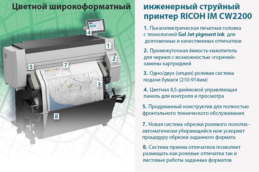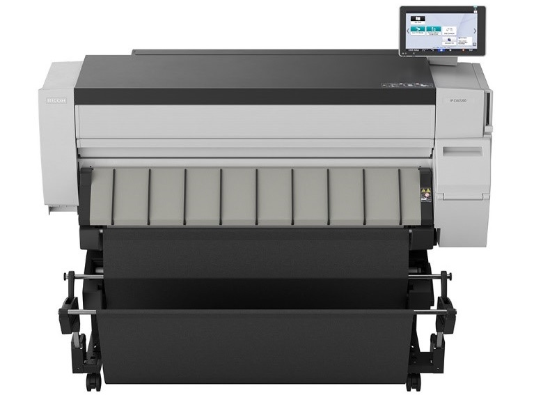 Ricoh IP CW2200 – новый цветной (CMYK) струйный широкоформатный инженерный плоттер формата А0 (ширина роля 914мм с максимальной длинной документа до 33м), с возможностью локальной и сетевой печати с разрешением 600*600dpi (до 1200*1200dpi на специальных материалах). Плоттер обеспечивает скорость печати до 2,1 листа А1 в минуту в цветном режиме и до 3,8 листа А1 в монохромном режиме.