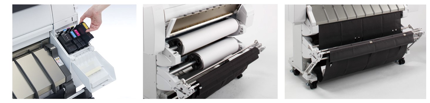Конструктив плоттера разработан таким образом, что обеспечивает возможность его текущего обслуживания с фронтальной плоскости, исключая необходимость перемещать аппарат в ходе эксплуатации. Большая управляющая панель позволяет предварительно просматривать материал для печати с usb-накопителя или sd-карты, а также перед отправкой по сети, во избежание возможных ошибок.