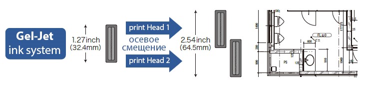 Печатная головка имеет ширину 32,4мм, а будучи установленными со смещением (на аппарате установлено две печатные головки со смещением) дает ширину печати до 64,5мм