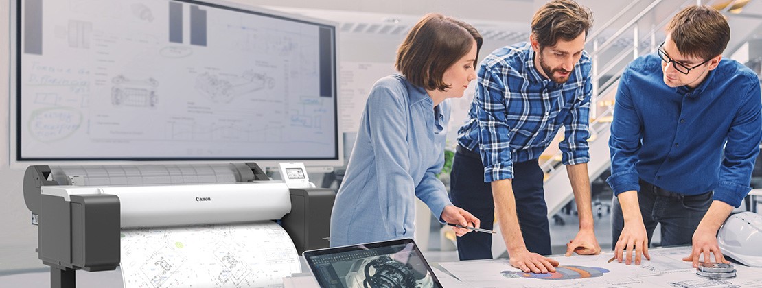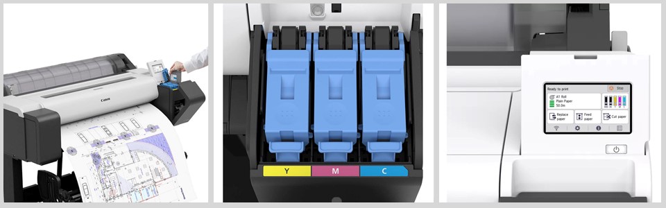 Машины серии оснащены цветной 4,3-дюймовой управляющей панелью с тач- интерфейсом, обеспечивают простоту и удобство ежедневной эксплуатации. Имеют на 30% сниженный уровень шумовой нагрузки, печать – вплоть до формата А0 с режимом «без полей»*, пять типов чернил (модель CMY+(обычый черный/матовый чёрный) с режимом «горячей замены» картриджей, разрешение печати 1200х2400 dpi по технологии Canon BubleJet on Demand (струйная термическая печать в режиме «капля по требованию») с отдельной заменяемой печатной головкой и сменным роликовым резаком для автообрезки отпечатков обеспечивают длительную эффективную эксплуатацию с минимальным техническим обслуживанием.