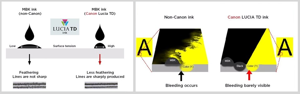 В новом принтере используется совершенно новый 5-цветный набор пигментных чернил серии Canon LUCIA TD. Эти чернила были разработаны для создания тонких линий и четкого текста как на специальной бумаге для струйной печати, так и для бумаги без специального покрытия. В комплекте реализована цветовая схема CMYK, где в качестве черного используется либо простой «чёрный», либо «матовый черный». Чернила в целом имеют более высокое поверхностное натяжение, по сравнению с предыдущим поколением, и обеспечивают воспроизведение более тонких линий, более четкие границы переходов между цветами (более выраженный краевой эффект). Так же в новом комплекте использована новая формула для пурпурных чернил, позволяющая получать более яркий красный цвет.