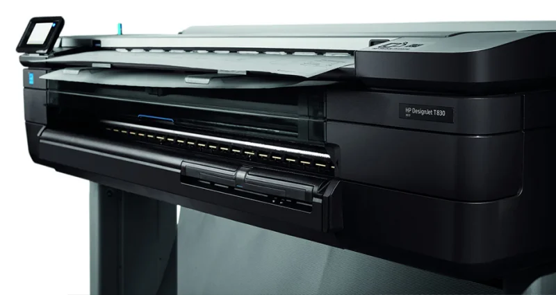 Это самая компактная модель широкоформатного МФУ HP. Малые габариты, надежный корпус на прочных роллерах, один шнур для включения питания, встроенный сканнер и поддержка Wi-Fi делают это МФУ универсальным устройством для инженерно-строительной среды и офисного использования. HP DesignJet T830 выпускается с 30 ноября 2015 года.